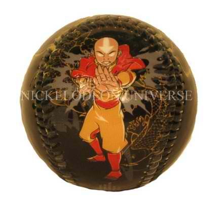 A regular sized hard baseball with plastic covering stitched on. Two poses of Aang on opposite sides of the baseball.