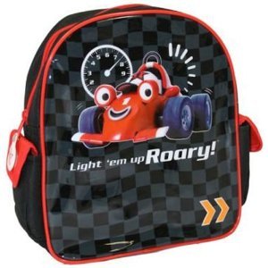 The Roary the Racing Car 2009 Backpack is zipped with side pockets. It comes in black with red and has a character picture on the front.